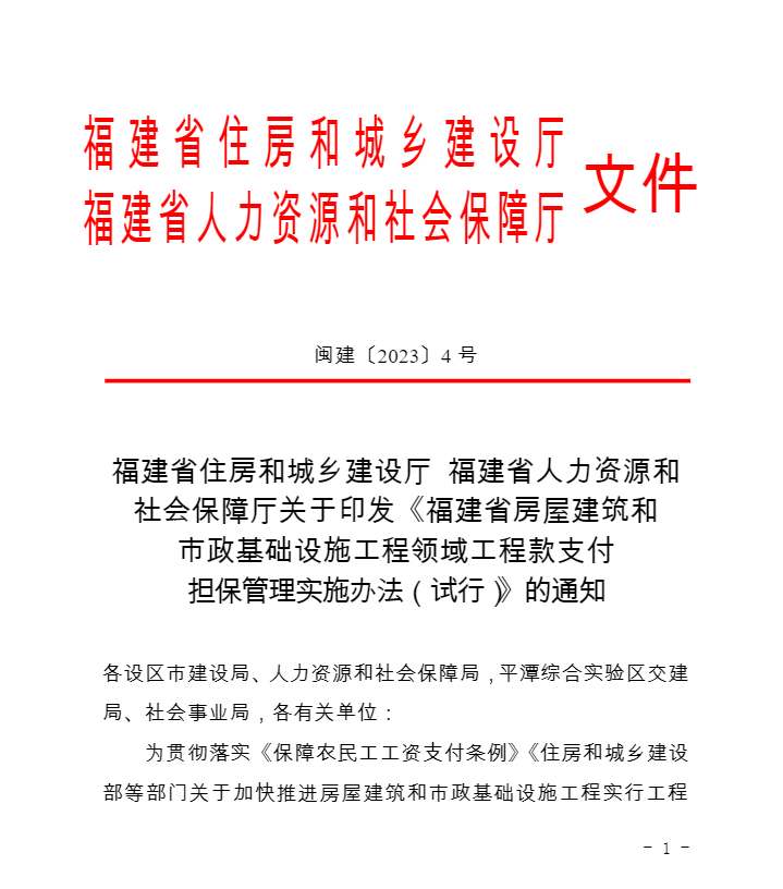 福建省住房和城乡建设厅福建省人力资源和社会保障厅关于印发《福建省房屋建筑和市政基础设施工程领域工程款支付担保管理实施办法(试行)》的通知